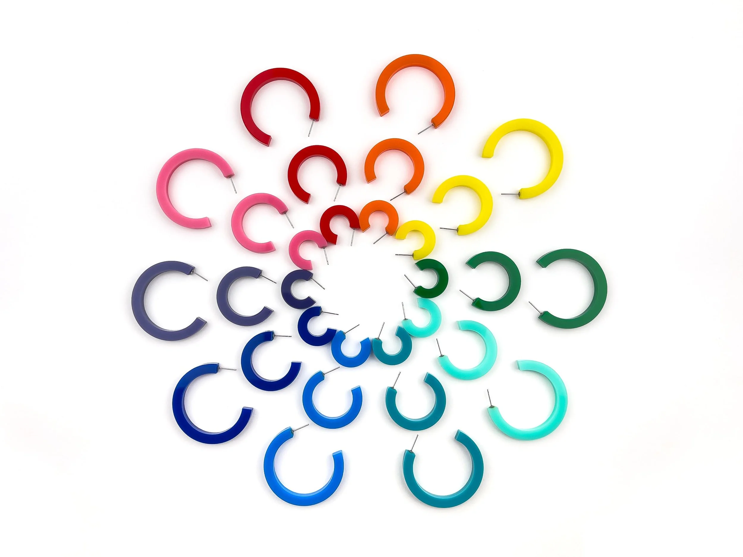 Eye-catching and colorful, these acrylic hoops feature a simple, clean design. Lightweight and comfortable, each pair is made with hypoallergenic stainless steel posts that are securely affixed.