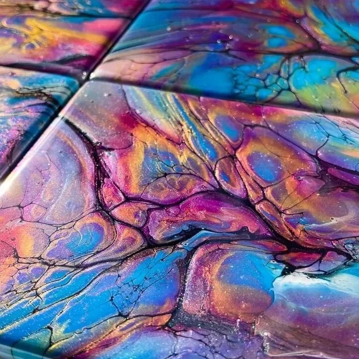 Featuring a ceramic tile base, shimmering mica powder and a beautiful depth of color, each coaster is finished with a coat of epoxy resin designed for countertops, making them functional, durable and eye-catching. They bring a touch of art to everyday life.